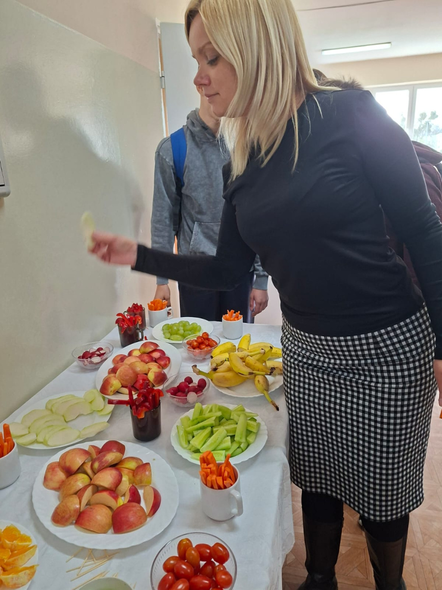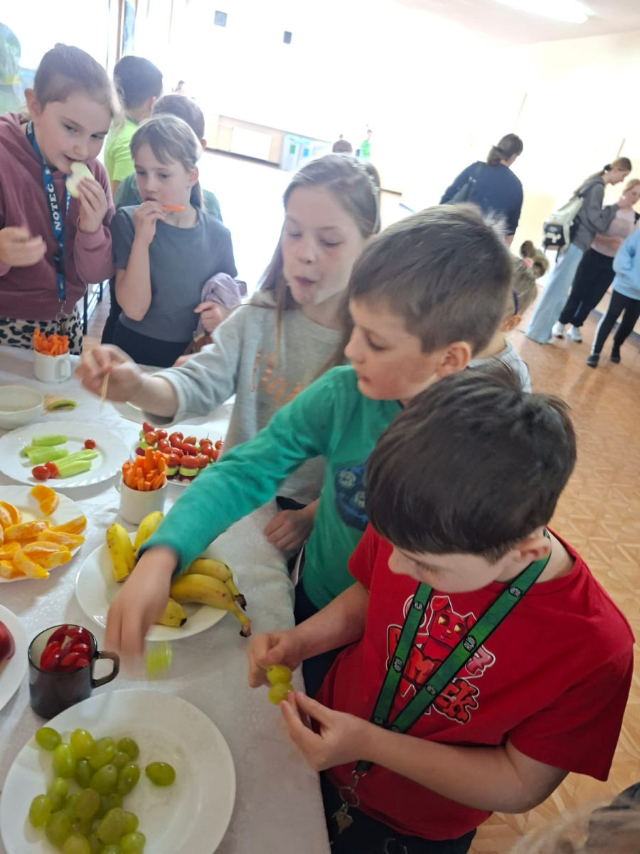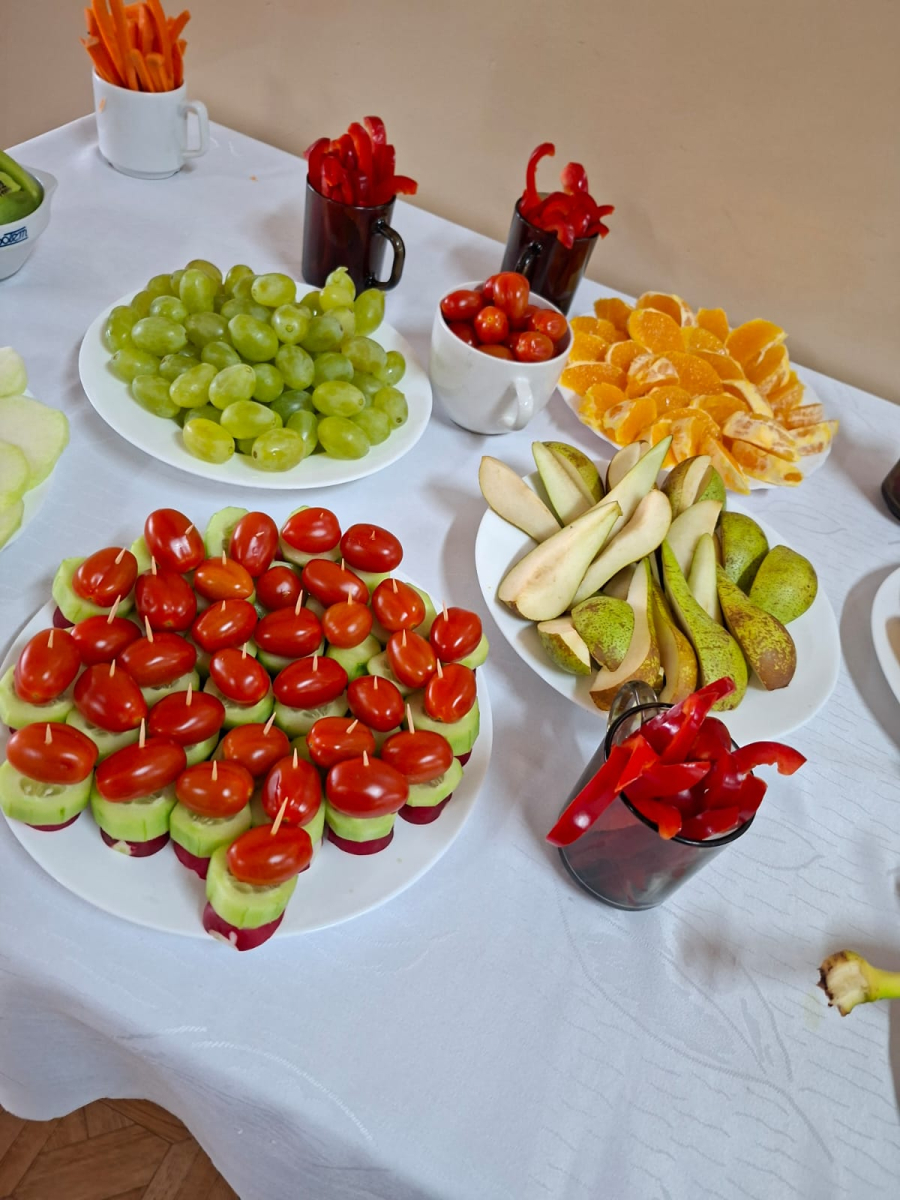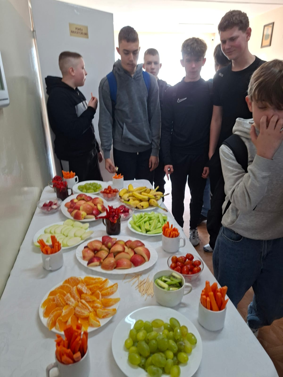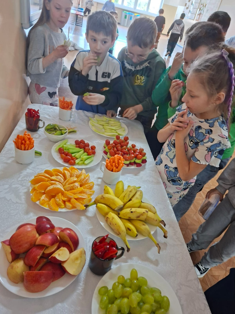 Oprócz ciekawostek i faktów na temat mózgu człowieka, wywieszonych na szkolnych gazetkach ściennych, zespół profilaktyczno-wychowawczy przygotował akcję ZDROWA PRZERWA. Na stolikach na parterze i piętrze szkoły zostały wystawione umyte i pokrojone świeże owoce ( kiwi, winogrona, pomarańcze, jabłka, gruszki, banany) i warzywa (marchewki, papryka, ogórki, mini pomidorki, kalarepa). Uczniowie zostali zapoznani z korzyściami płynącymi ze zjedzenia powyższych fruktów( wspomaganie koncentracji i pamięci, poprawa krążenia krwi w mózgu, stabilizacja poziomu cukru, dostarczenie potasu (hamującego stres,), antyoksydantów ( chroniących neurony), beta- karotenu( wspierającego rozwój komórek nerwowych). Wszyscy uczniowie chętnie skorzystali ze smacznych przekąsek. Duża ilość serwowanych darów natury spowodowała, że każdy mógł spróbować wszystkiego i tym samym zasilić swój organizm w zdrowe paliwo.
