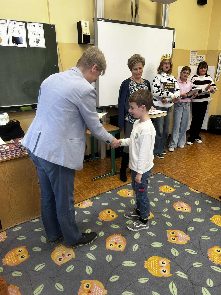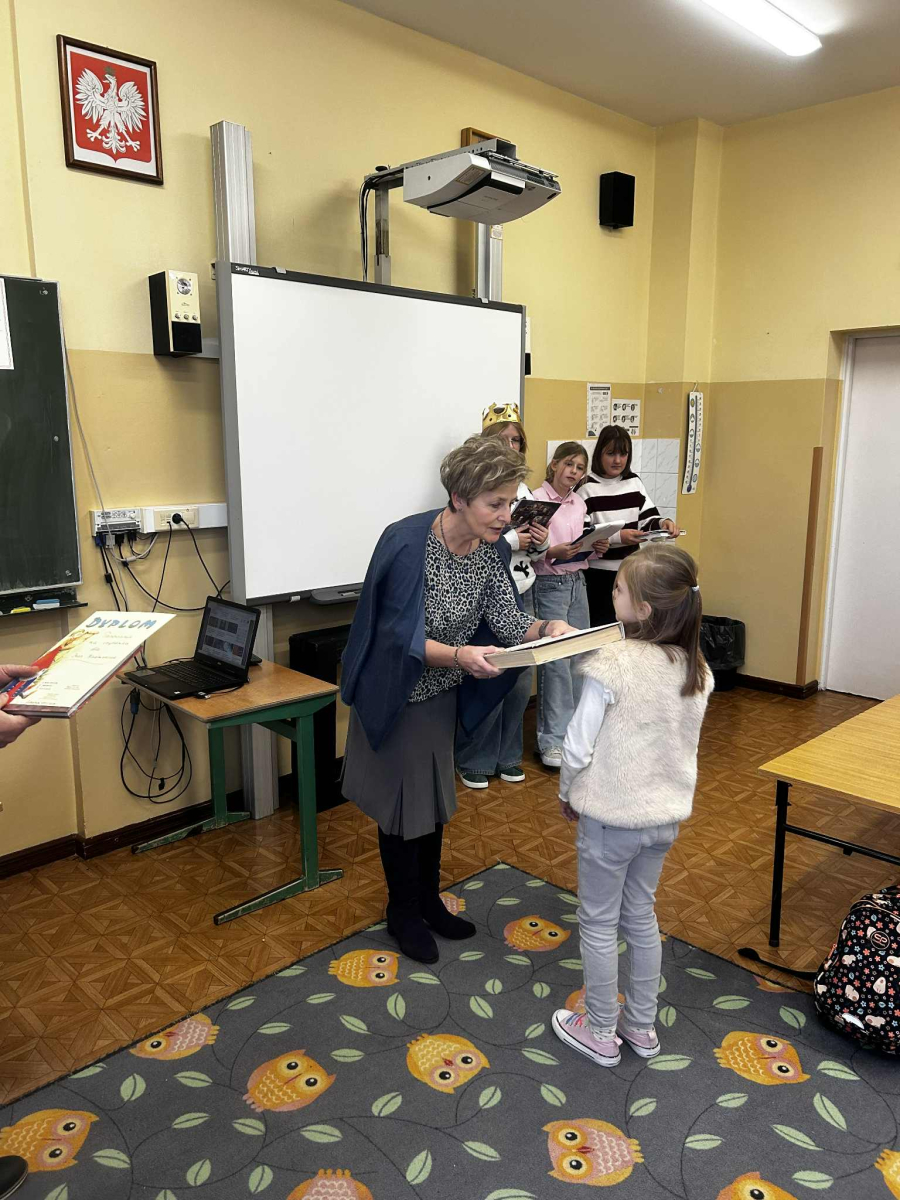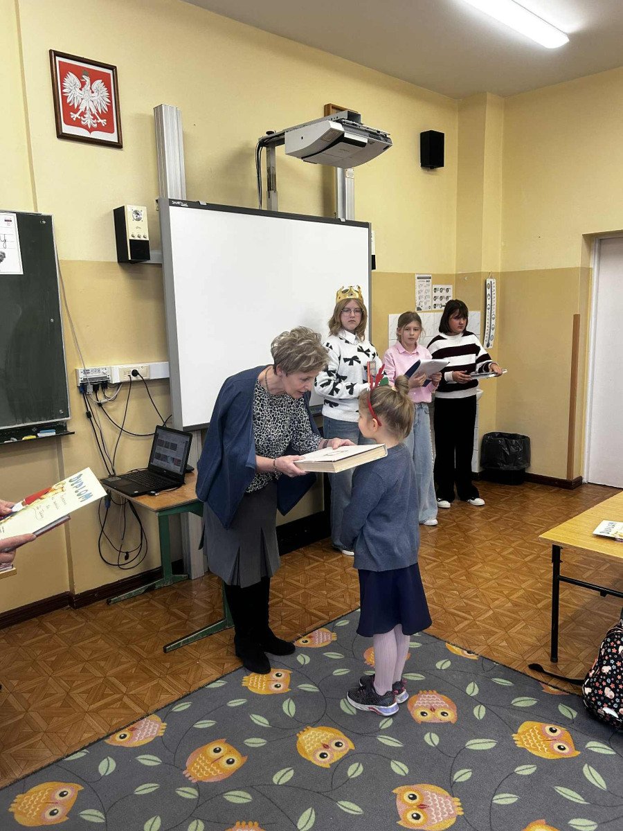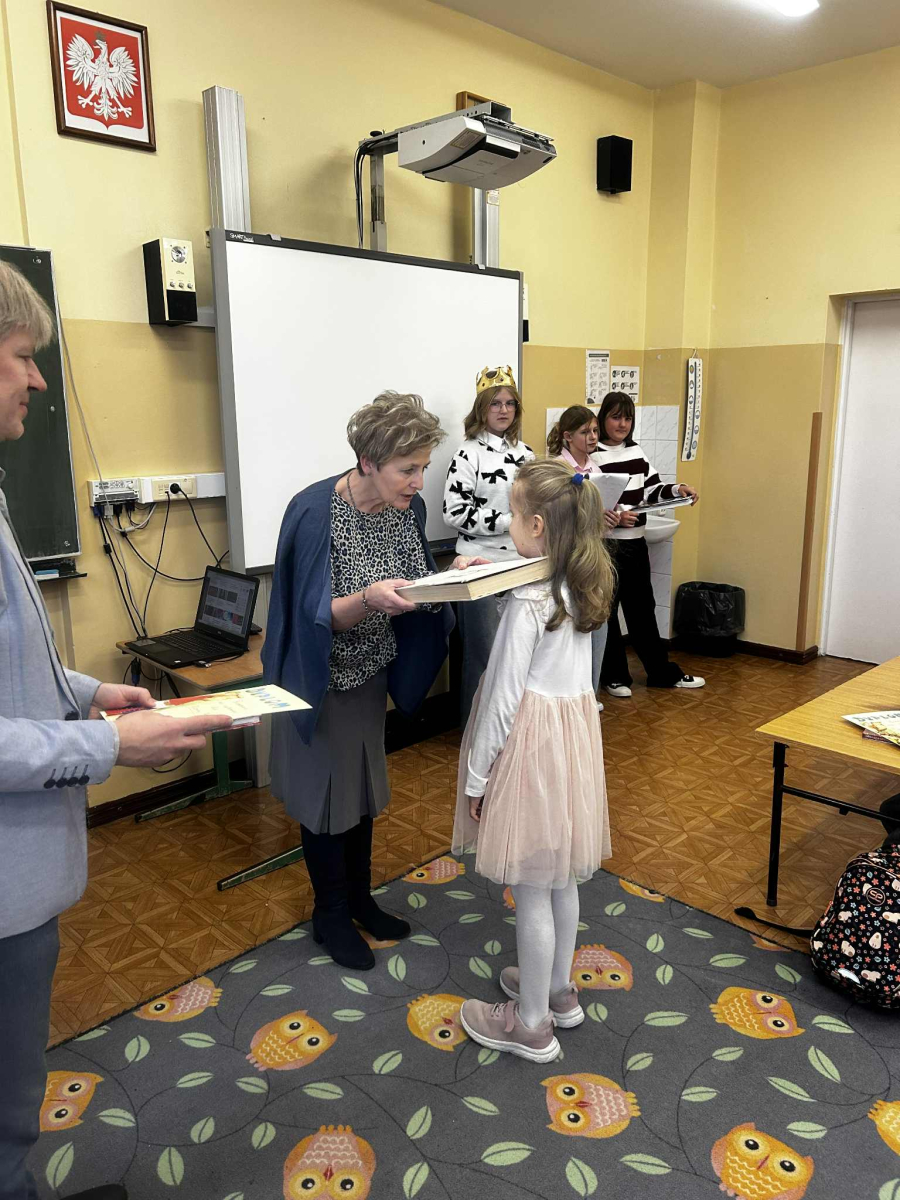 "Posłuchaj koleżanko, kolego posłuchaj, czytanie jest dla głowy jak deser dla brzucha" - takie słowa wyśpiewali nasi Pierwszoklasiści, którzy zostali dziś pasowani na czytelników, wskutek czego stali się pełnoprawnymi użytkownikami szkolnej biblioteki. Zanim Pani Dyr. E. Kaczmarek dokonała specjalnym egzemplarzem "Pana Tadeusza" aktu pasowania, młodzi czytelnicy zapoznali się z regulaminem biblioteki, wysłuchali programu przygotowanego przez starsze koleżanki w tym próśb Królowej-Książki dotyczących właściwego szanowania książek i zdali symboliczny test ze znajomości bajkowych postaci. Wszyscy pasowani otrzymali w prezencie książkę-wyprawkę, okolicznościowy dyplom i zakładkę. Wszystko to działo się w obecności Wychowawcy klasy, Nauczycieli wspomagających, a także Nauczycieli-bibliotekarzy, którzy przygotowali dzisiejsze wydarzenie.