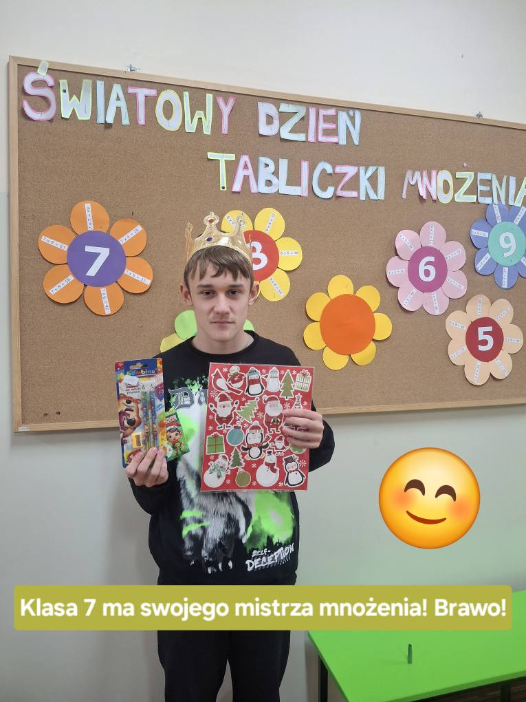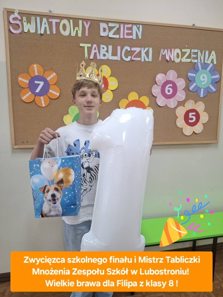 W ramach obchodów odbył się szkolny konkurs matematyczny. Najpierw przeprowadzilismy eliminacje klasowe, w których udział wzięli wszyscy uczniowie. Najszybsi z bezbłędnymi wynikami przeszli do drugiego etapu. W wielkim finale zwyciężył Filip Baran z klasy 8, zdobywając zaszczytny tytuł Mistrza Tabliczki Mnożenia Zespołu Szkół w Lubostroniu. Serdecznie gratulujemy!