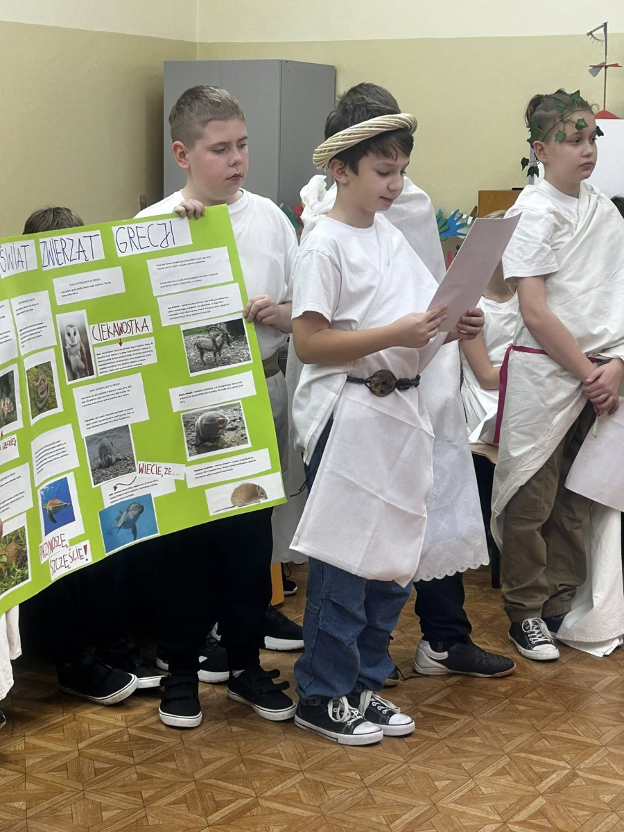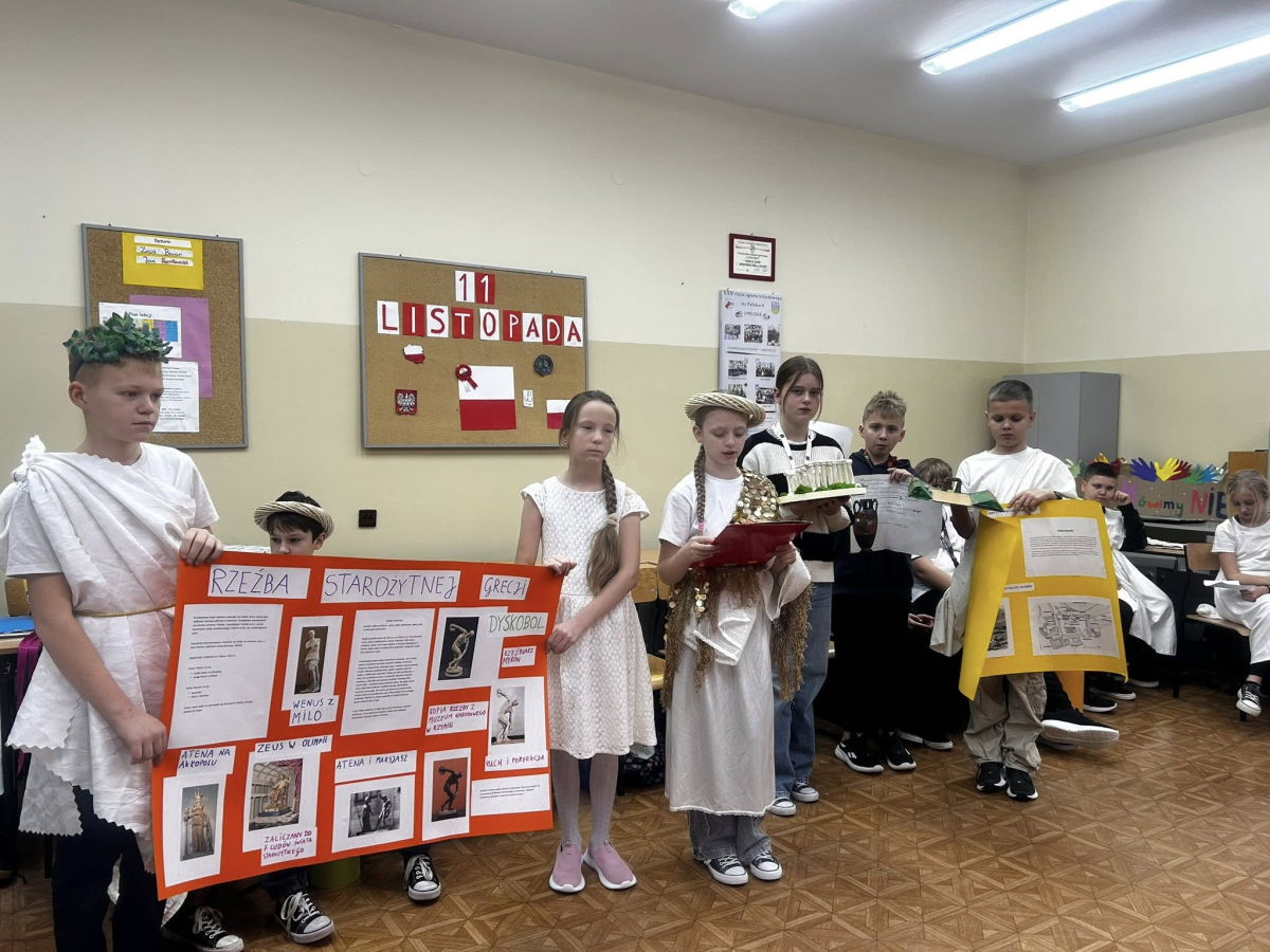 W grudniu uczniowie klasy V zrealizowali projekt edukacyjny „Wizyta w starożytnej Grecji”. Pracując w grupach, piątoklasiści zabrali nas w fascynującą podróż do świata antyku: